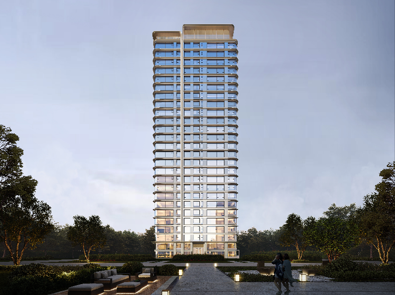 建筑立面糅合德系建筑的三段式立面关系,楼栋冠顶提取海鸥、波浪、夕阳等元素,采用以玻璃、铝板与墙体结合为主的重檐设计,金色的装饰线条及飘板质感拉满。