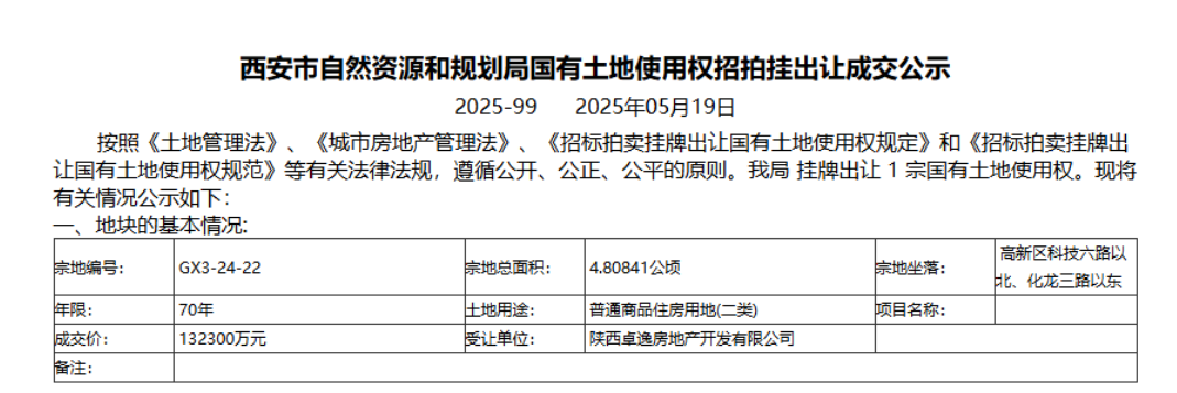 高新区也同样备受关注。5月16日,卓逸地产13.2亿摘得高新区丝路软件城GX3-24-22地块,楼面价11006元/m²,成为2025年高新首宗“万元地”。