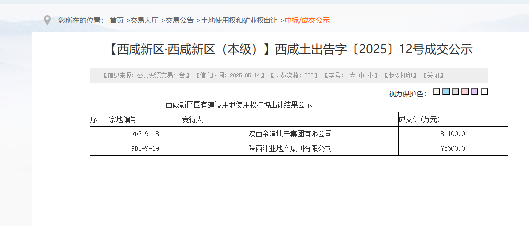 同天,金湾地产以8.11亿元的底价竞得沣东新城科统片区1宗住宅用地,折合地价1073.18万元/亩、楼面地价6446.26元/m²;沣业地产7.56亿摘得1宗70.277亩住宅用地,土地单价1076万元/亩,楼面单价6454元/m²。